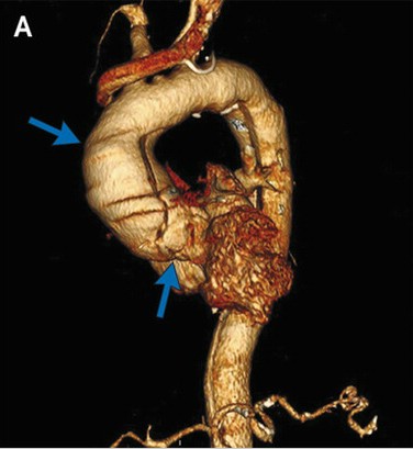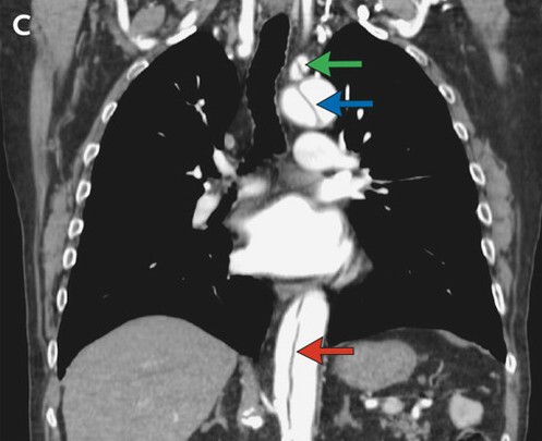 胸腹部CT血管成像示升主动脉瘤(图A,蓝色箭头),DeBakey I型主动脉夹层动脉瘤。该夹层涉及了升主动脉(图B,白色箭头),主动脉弓(图C,蓝色箭头),以及降主动脉(图B、C,红色箭头),结束于肾动脉起点之下。同时还涉及了几条血管分支,包括右头臂动脉、左锁骨下动脉(图C,绿色箭头)和肠系膜上动脉。