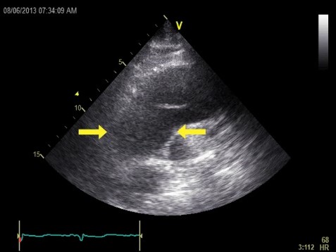 患者男性,81岁,既往无良性前列腺肥大所致耻骨上疼痛及尿潴留的急诊病史。偶然发现肌钙蛋白水平升高:0.17ng/ml(正常值<0.08)。患者称无胸背痛或气促。心电图未显示缺血性改变。胸部X线示纵隔增宽。经胸壁超声心动图示升主动脉水平有一胸主动脉夹层动脉瘤(箭头所示)。
